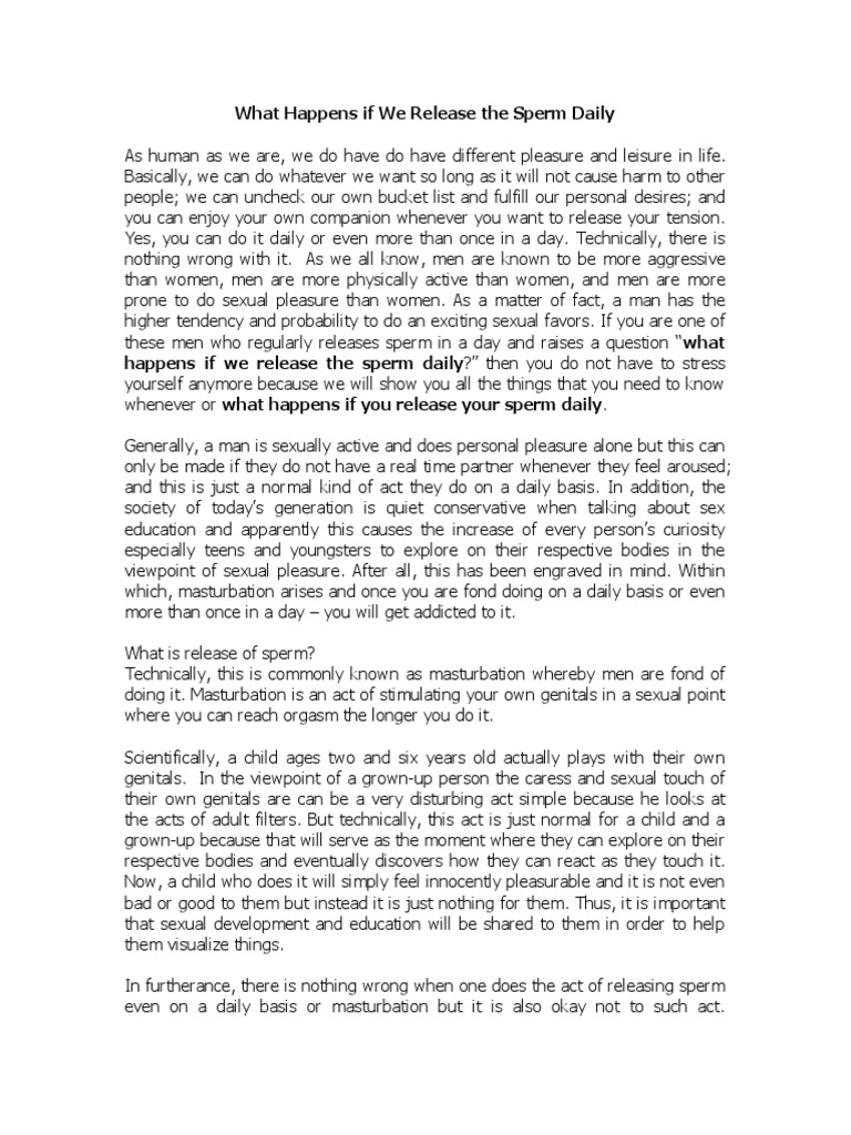 What Happens If We Release Sperm Daily? Proven Facts vs. MythsAccessibility links Search results Web results What happens to sperm if we release them, and we are ...People also ask results on the Web What if we release Sperm Daily? Data from vs ...What happens if we release sperm daily at the age of 14 ...What happens if we release sperm daily? ¦ Masturbation ...Disadvantages of releasing sperm daily - LybrateWhat happens when the release of sperm daily at the age of 16. What if we release sperm daily? Speaking Tree How often should a man ejaculate? - Medical news today What if we released Sperm Daily? What if we get sperm every day? Learn searches ...Related searches17aredisadvantagesreleasing161021241320 Pages navigation1 Foot links