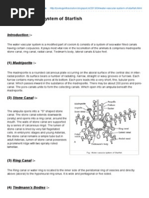 The water vascular system of the starfish is a hydraulic system made up of a network of fluid-filled canals and is concerned with locomotion adhesion food manipulation and gas exchange. Circular ring canal. WATER VASCULAR SYSTEM-AMBULACRAL SYSTEM IN STARFISH Water vascular system or ambulatory system is a unique system of echinoderms which helps mainly in locomo.